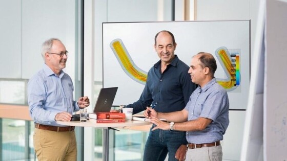Dr. Wolfgang Drahm (til venstre) og Dr. Alfred Rieder (i midten) har bygget opp et senter for pre-utvikling. Sammen med teamet sitt og kolleger i Endress+Hauser Flow – her representert ved Dr. Vivek Kumar – utvikler de nye innovasjoner.